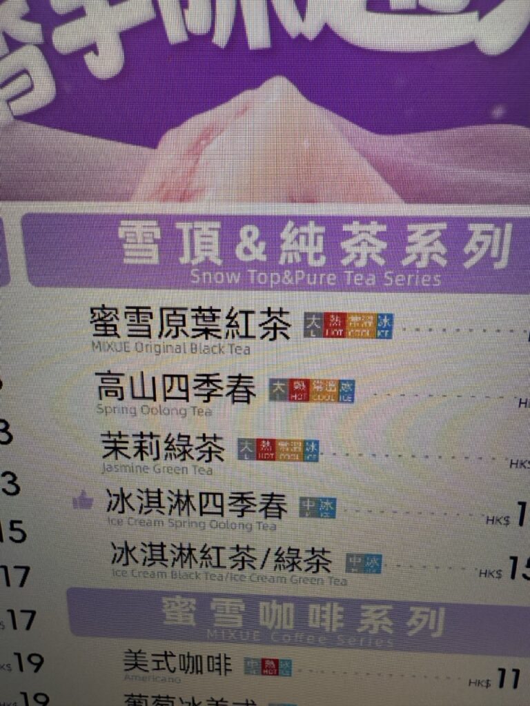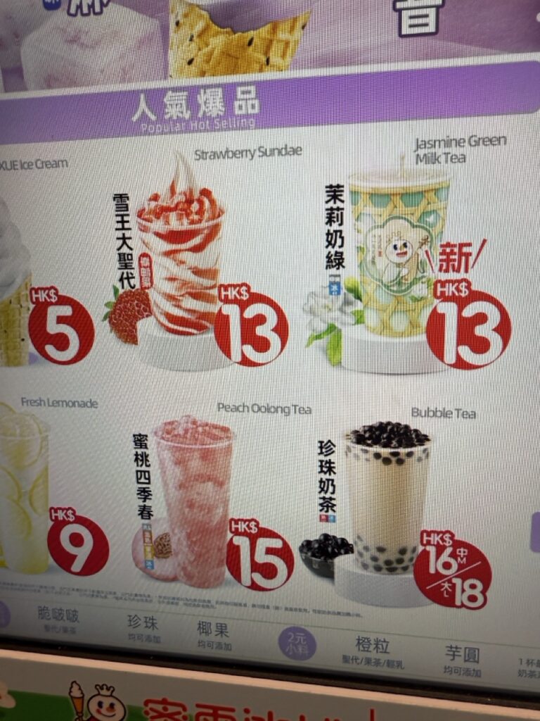 ショッピングモール内にある台湾発のデザートチェーンで、いちごミルクシェイクやソフトクリーム、フルーツティーが人気です。小学生の子どもでも飲みやすいサイズがあり、価格も1杯13HKDほどとお財布に優しいのが嬉しいポイント。ショッピングの合間に立ち寄って、甘いスイーツで疲れを癒やしましょう。