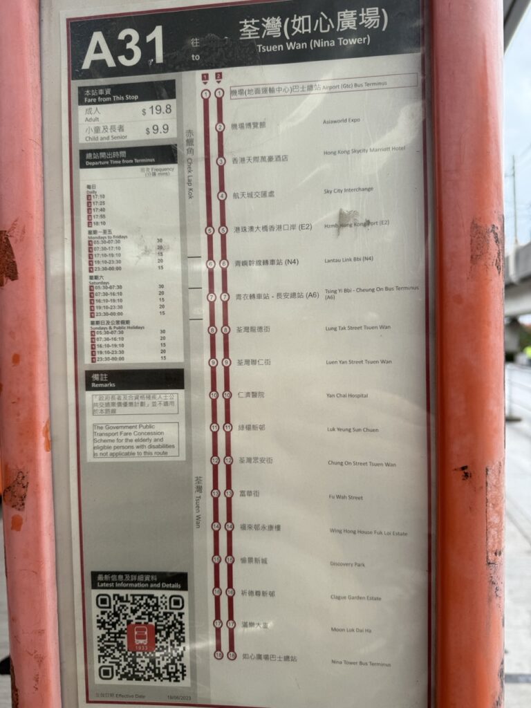 - 香港国際空港からエアポートバス(A31)で直行(19.8香港ドルで、リーズナブル)